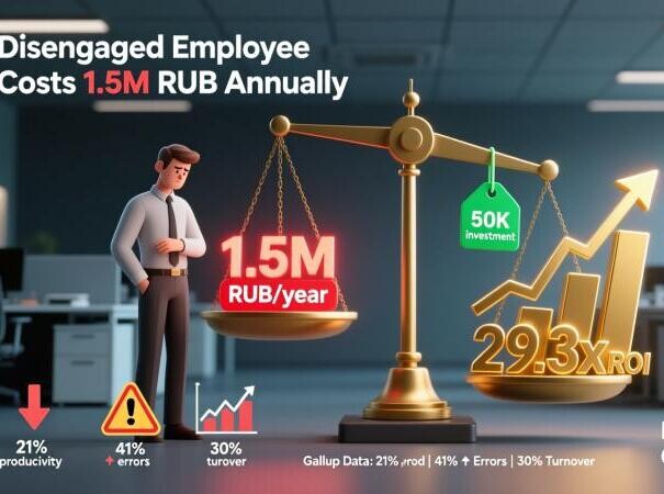 Разница в отдаче вовлечённого и невовлечённого сотрудников с ежемесячной зарплатой 200.000 ₽ составляет 1,5 млн. ₽ в год или 7,5 окладов. ROI возврата потраченных 50.000 ₽ на вовлечение в работу составляет 2 934,8% или 29.3 рубля будут получены на каждый вложенный таким образом рубль. Это крайне выс...